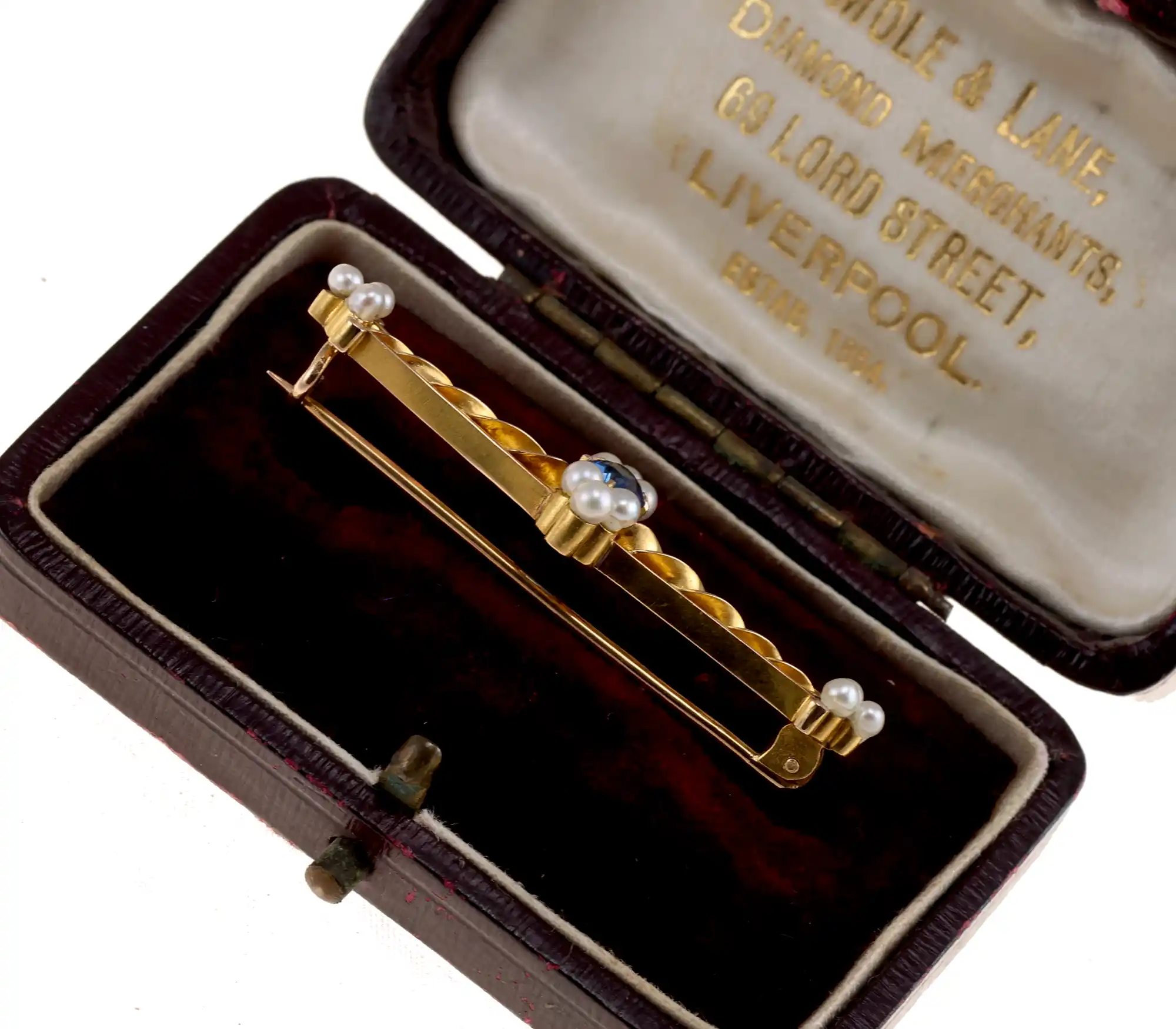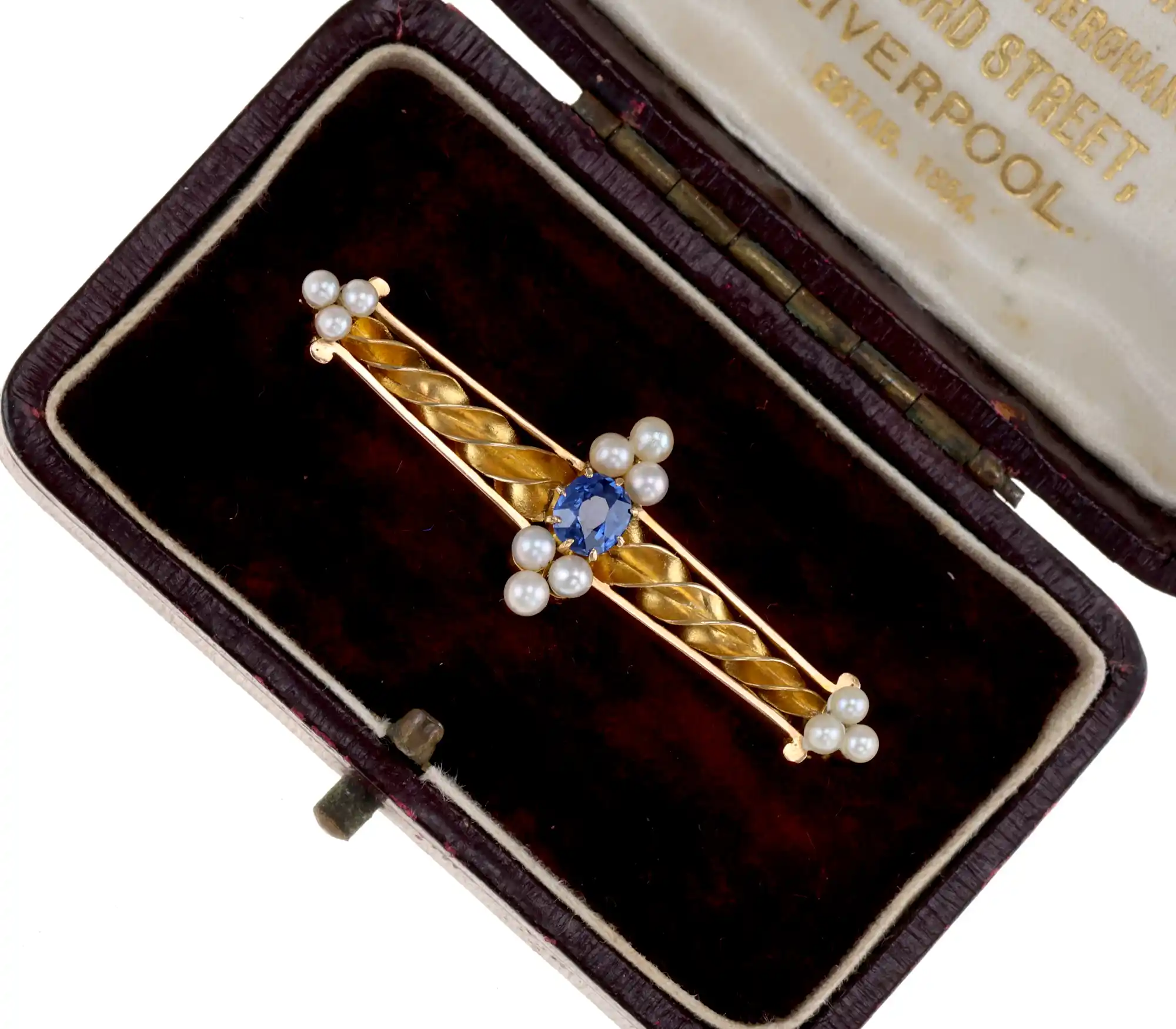 Złota broszka próby 750 zdobiona niebieskim szafirem i perłami. Spiralna, liniowa forma i symetryczne rozmieszczenie kamieni podkreślają klasyczny styl biżuterii. Francuskie znaki probiercze.