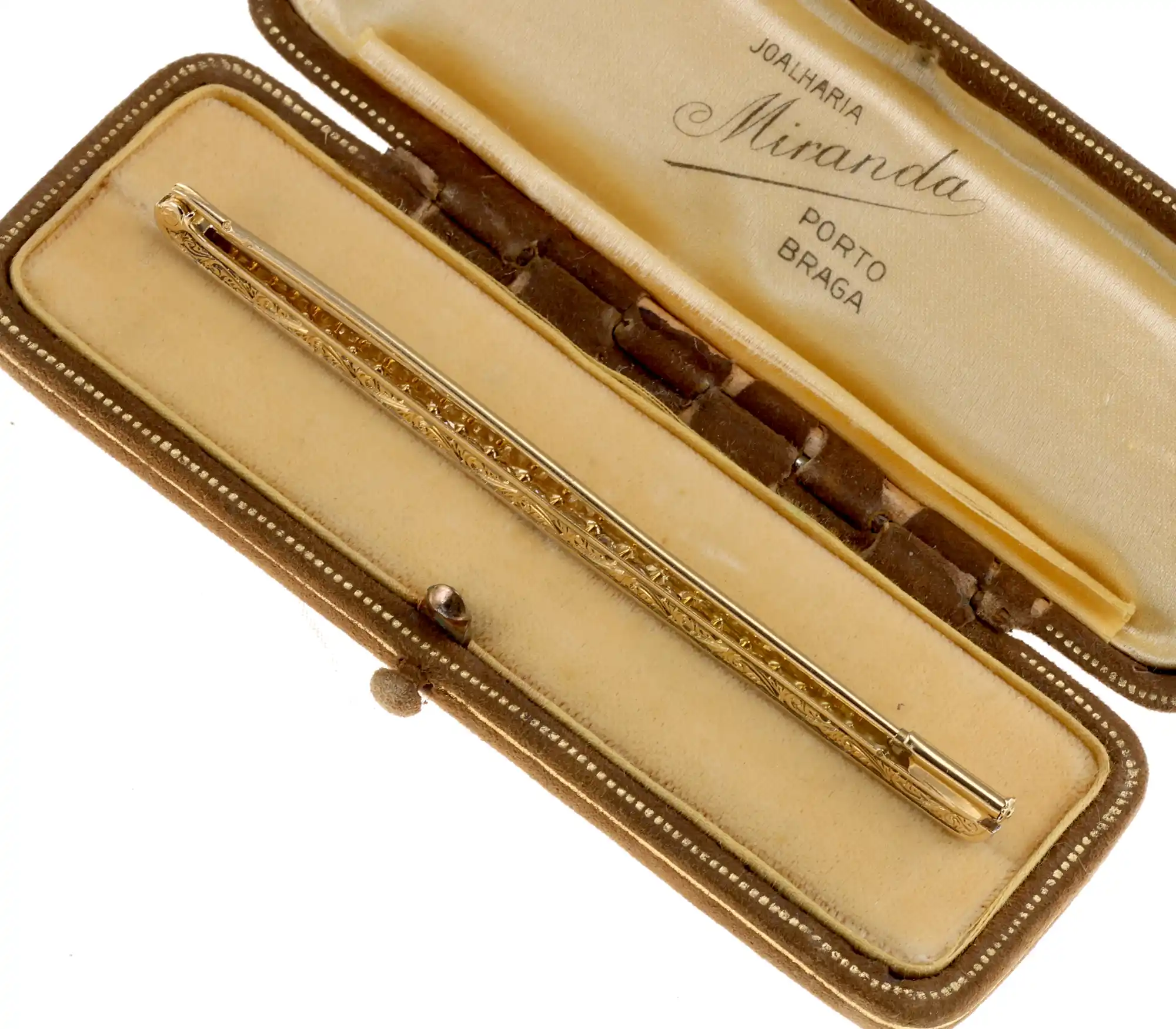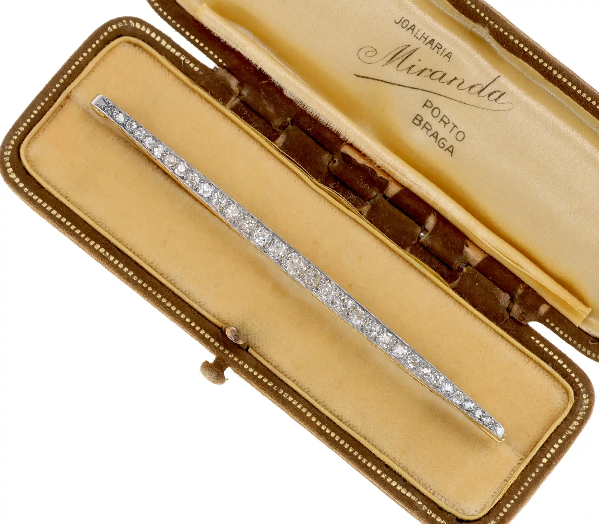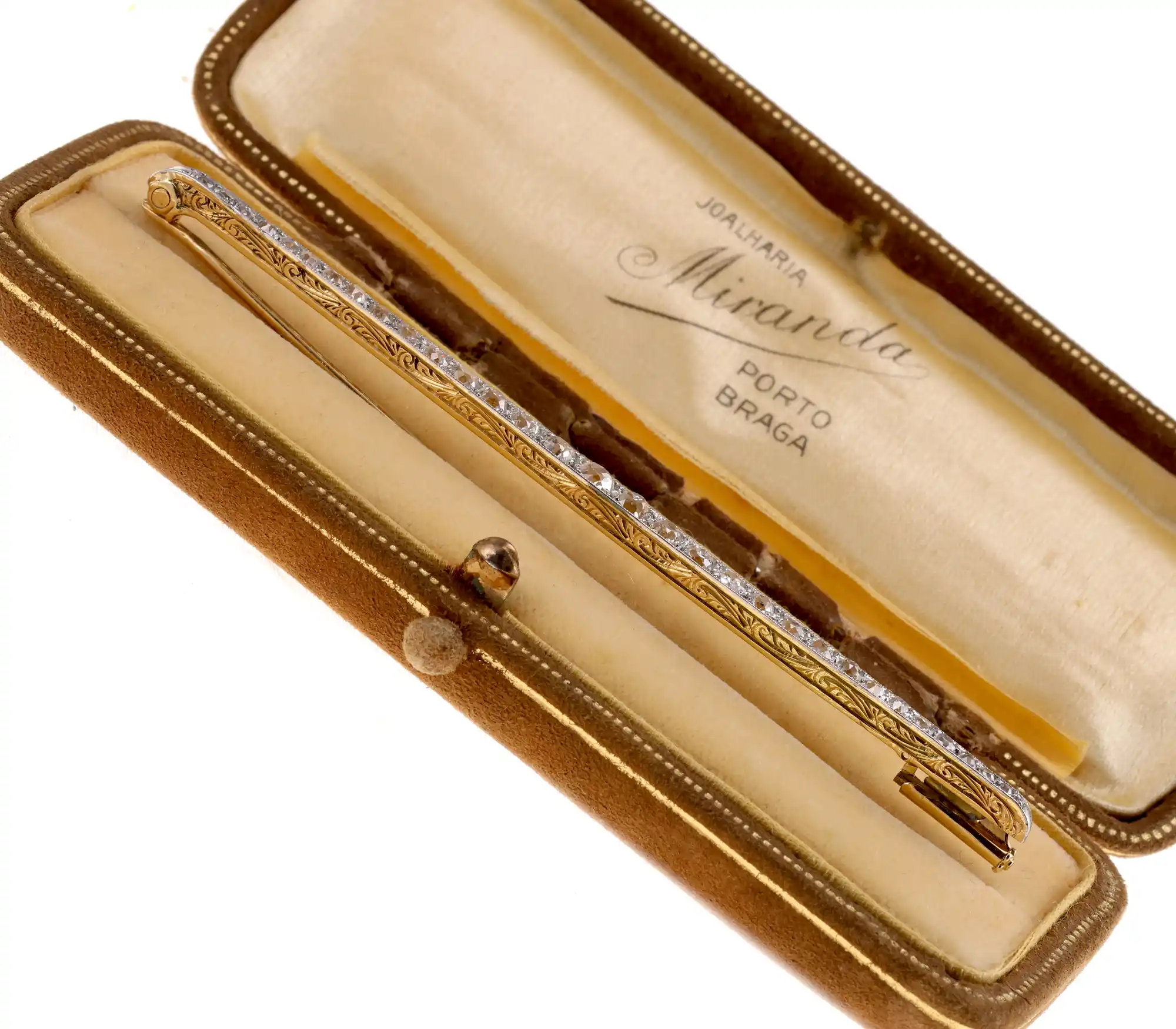 Dawna francuska broszka, będąca przykładem kunsztu jubilerskiego z epoki, wykonana ze złota 18K i platyny. Jej smukła, wydłużona forma jest w całości pokryta licznymi diamentami w dawnych szlifach, o łącznej masie 2,25ct. Po bokach znajduje się misternie wykonany grawerunek.