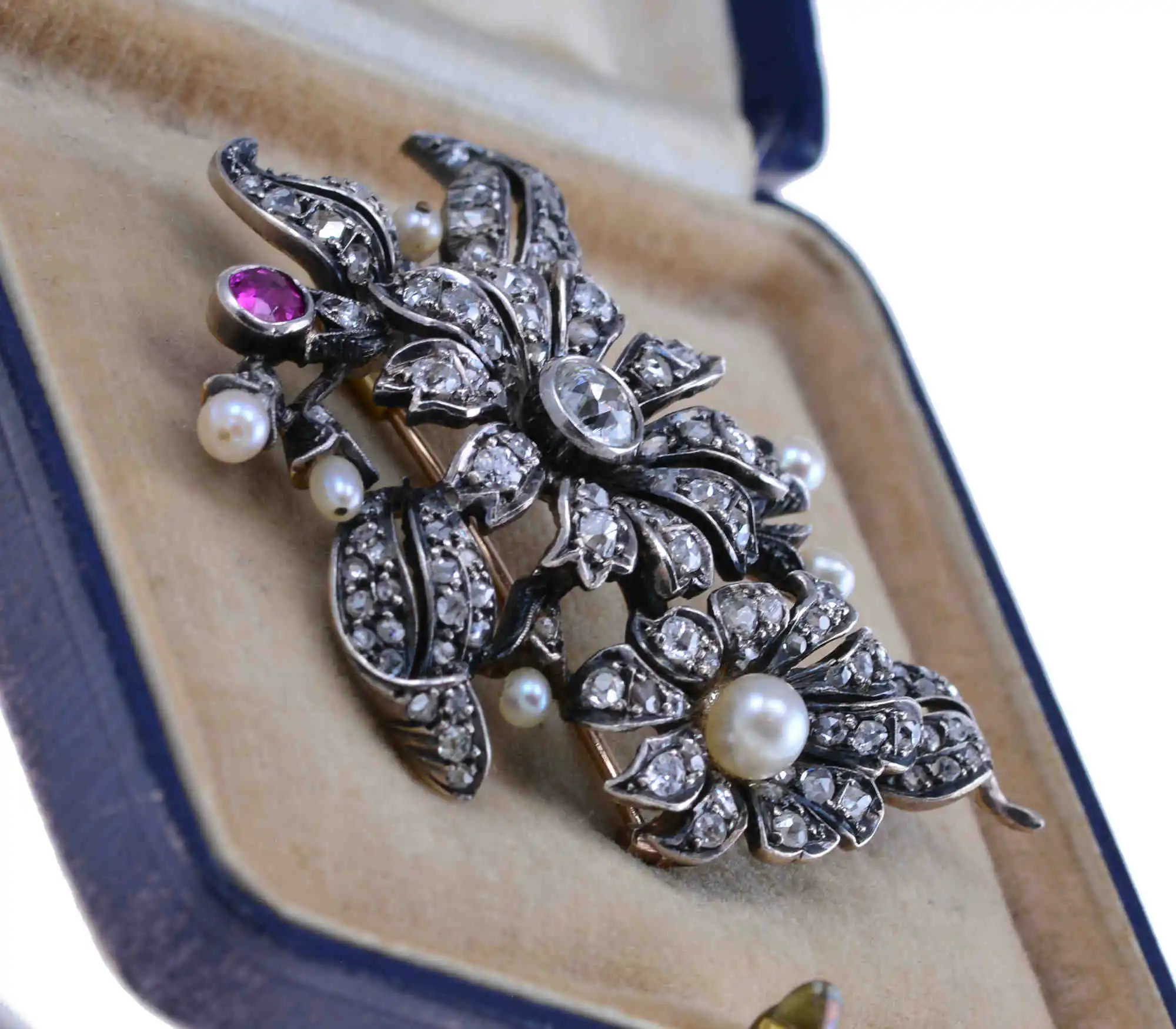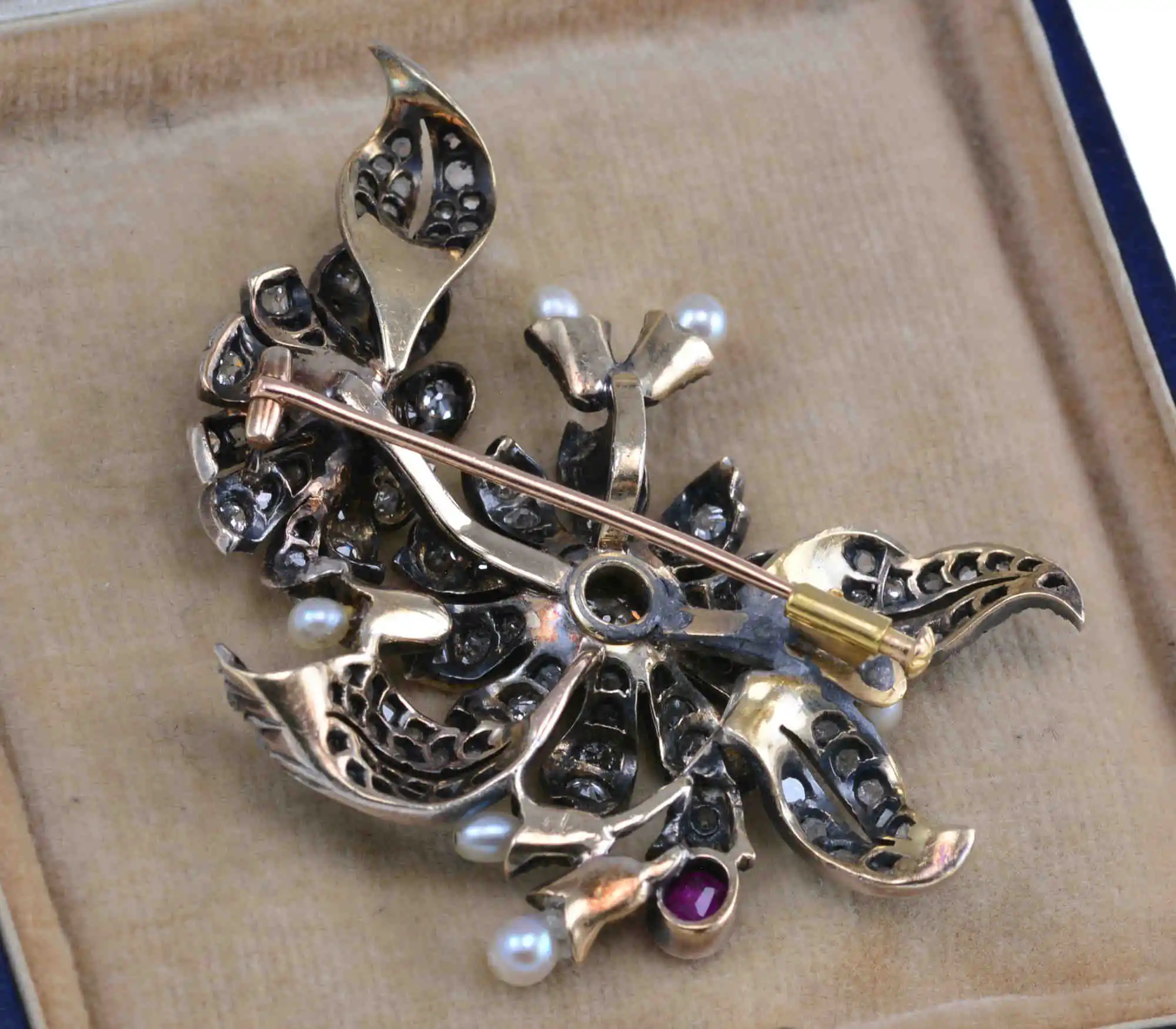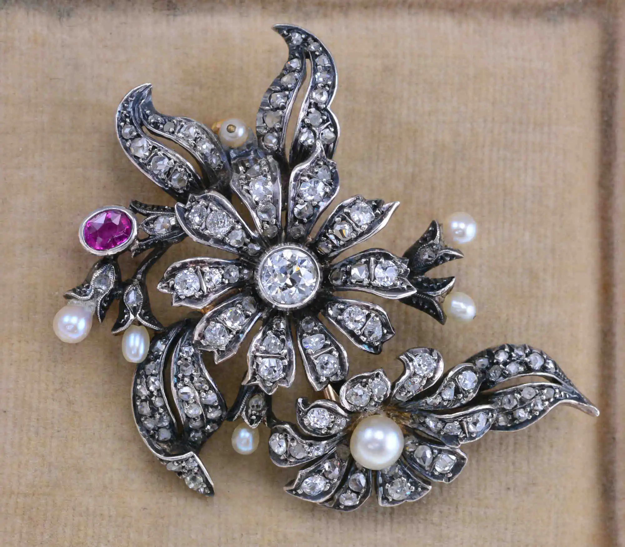 Okazała brosza o wyrafinowanej kompozycji florystycznej, stanowi przykład bogatego rzemiosła jubilerskiego z XIX lub początków XX wieku. Wykonana z kombinacji złota i srebra, bogato zdobiona diamentami w starych szlifach, a także pojedynczym naturalnym rubinem, dodającym intensywny akcent kolorystyczny. Użycie pereł (słonowodne) dopełnia kompozycję, podkreślając delikatność i elegancję całości. Styl wykonania sugeruje pochodzenie portugalskie.