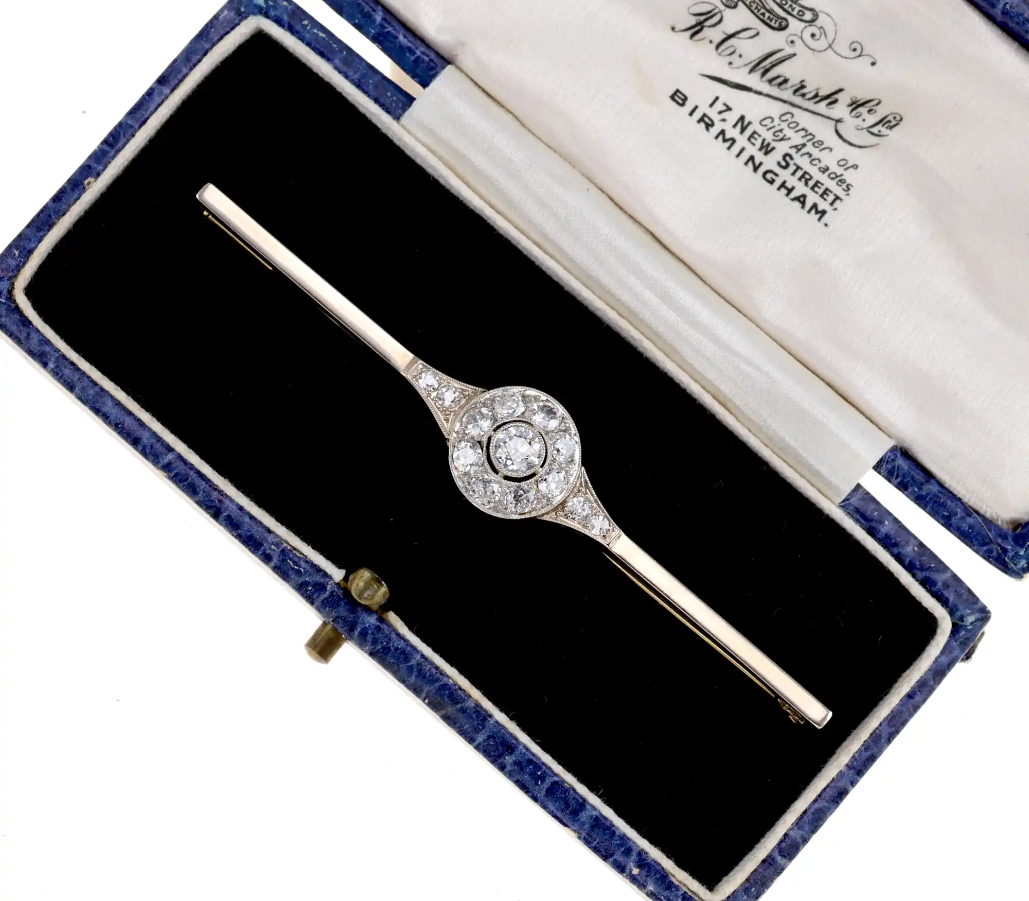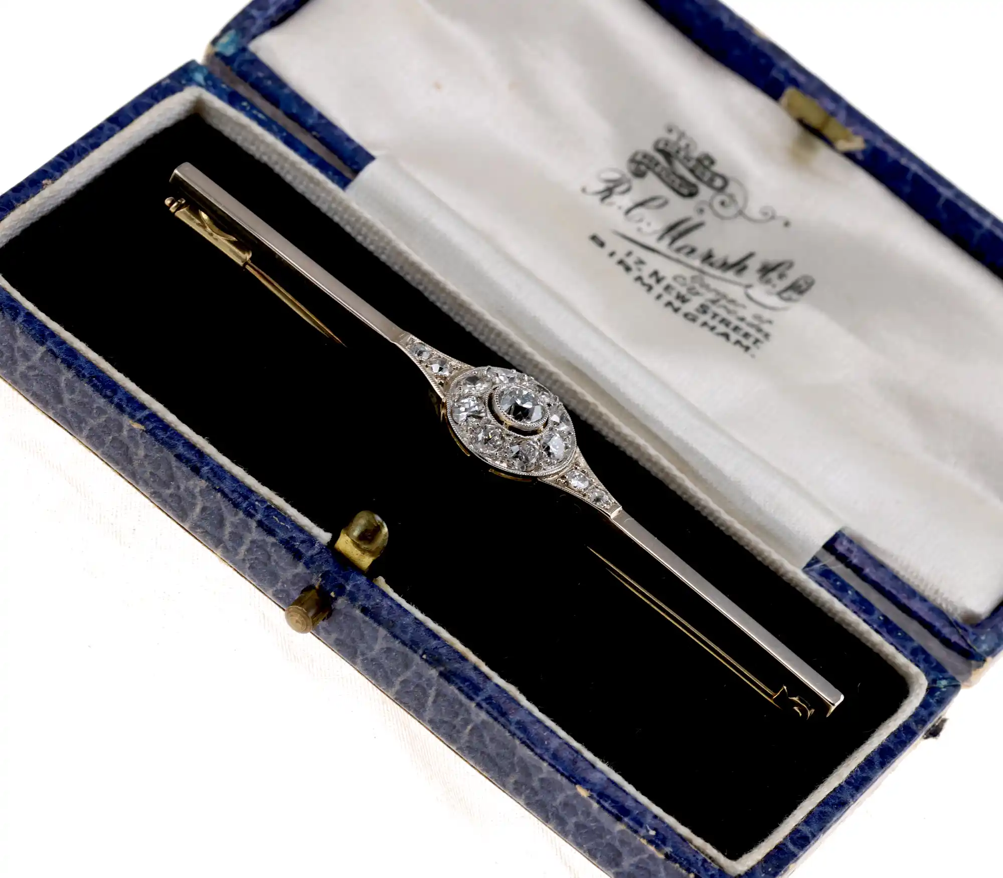 Klasyczna brosza ze złota próby 585 i platyny. W centralnej części kompozycji osadzono brylanty w szlifie starym europejskim i współczesnym (1,00ct) zaś jej boczne ramiona zdobią cztery diamenty w szlifie 8/8 (0,11ct).