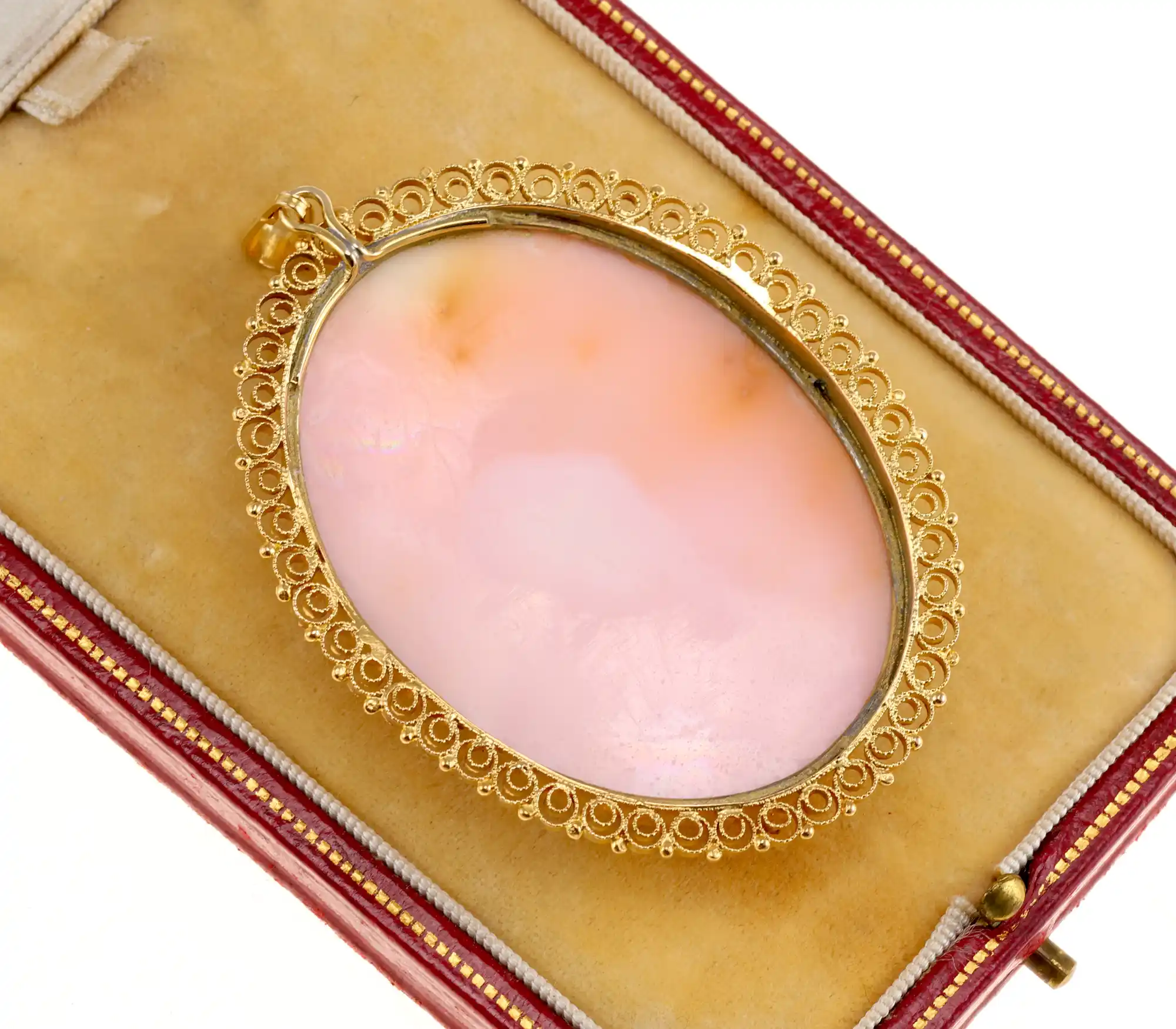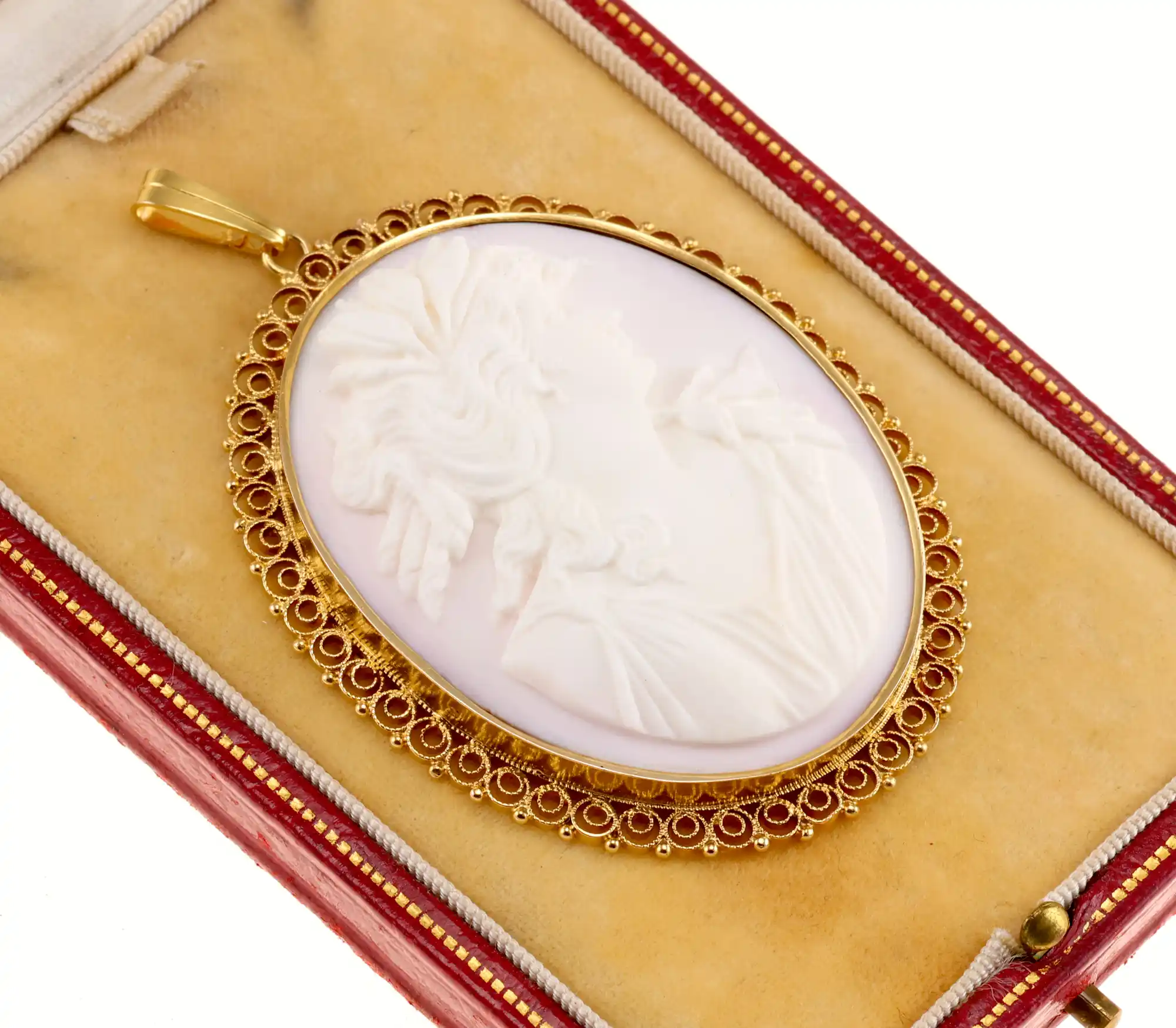 Okazały medalion z kameą rzeźbioną w muszli – 14K