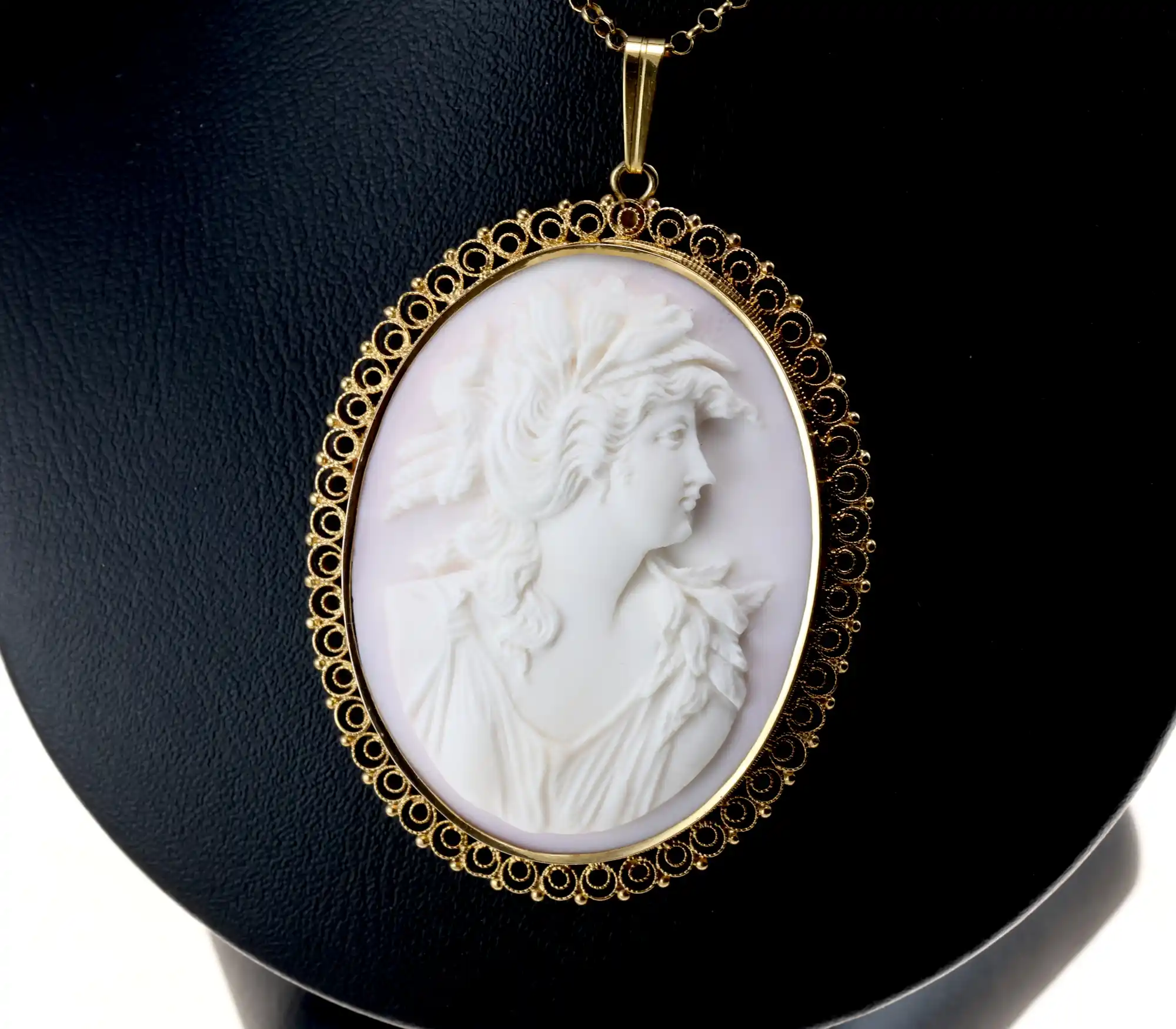 Imponujący medalion z misternie rzeźbioną kameą w muszli. Kamea przedstawia subtelny profil młodej kobiety. Delikatność rzeźby podkreśla bogata, koronkowa oprawa ze złota, tworząca finezyjną ramę dla tego klasycznego motywu. Połączenie szlachetnego materiału, kunsztu dawnych mistrzów i romantycznej symboliki sprawia, że medalion zachwyca nie tylko formą, lecz także nostalgicznym urokiem epoki, z której czerpie inspirację.