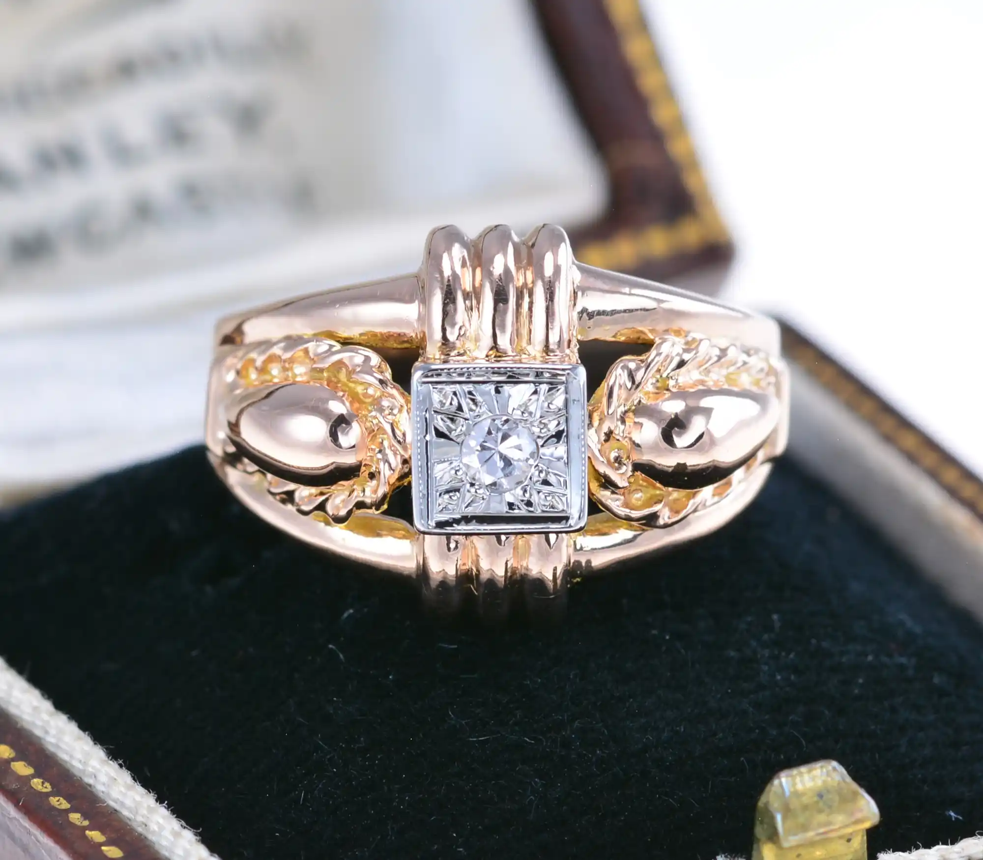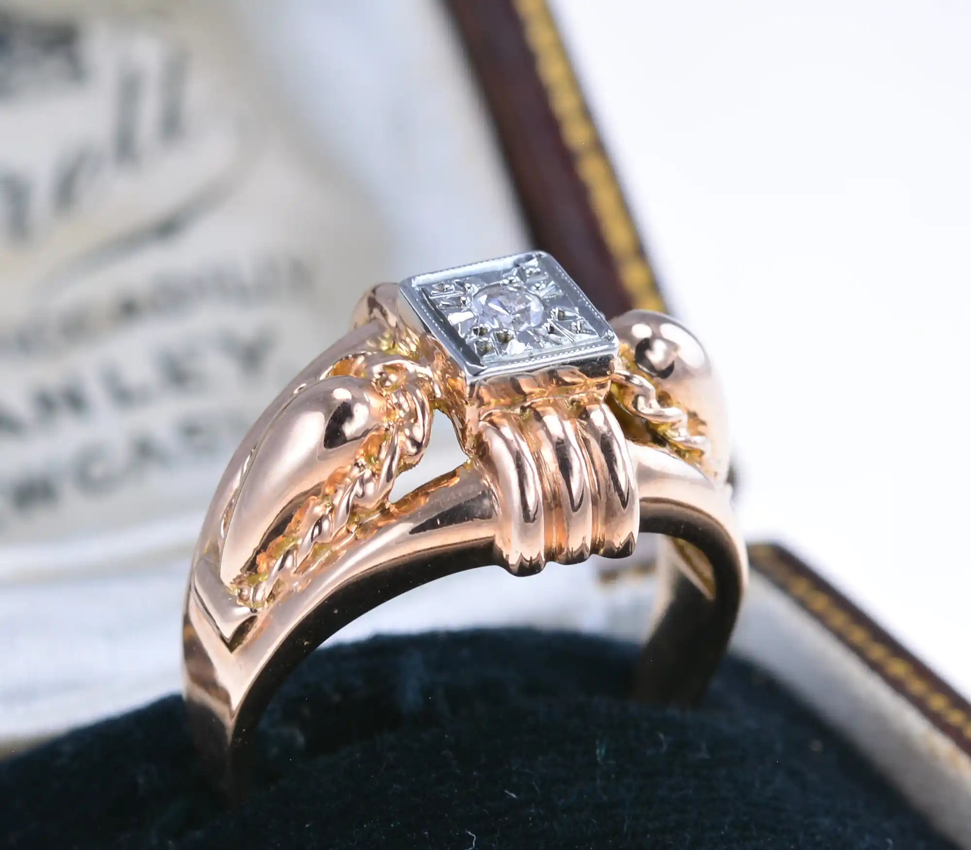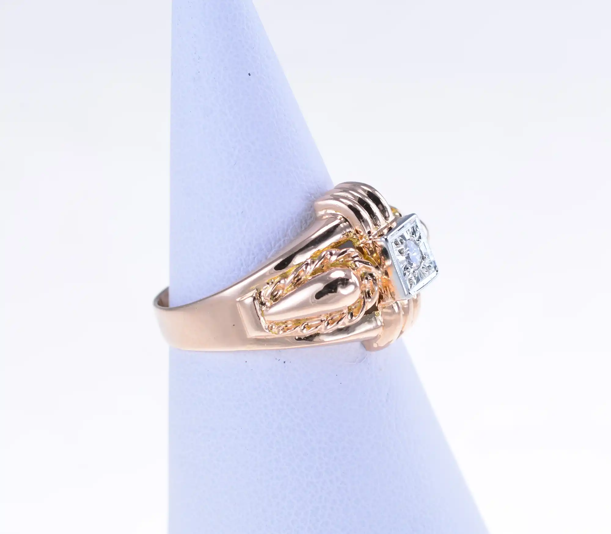 Szeroki francuski pierścionek ze złota próby 750, z centralnie oprawionym diamentem w szlifie uproszczonym o masie 0,05ct. Ramiona pierścionka są bogato zdobione, z motywami przypominającymi splecione liny lub stylizowane liście.