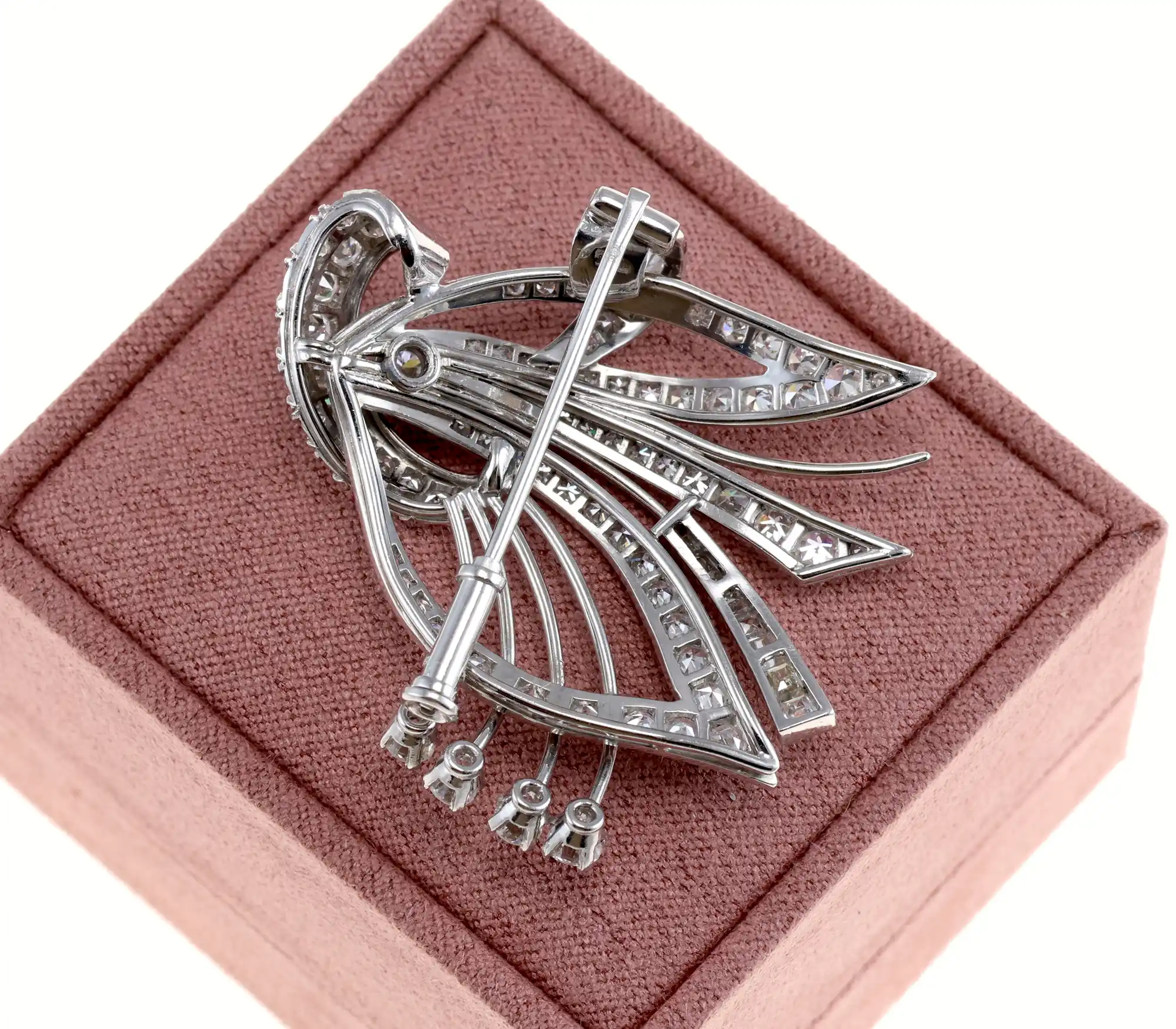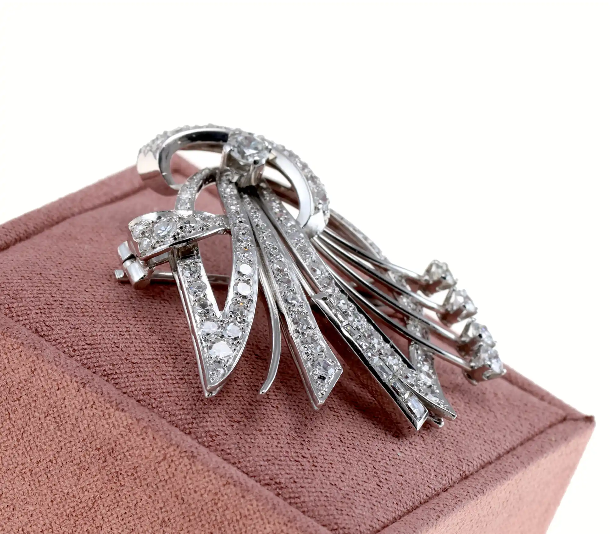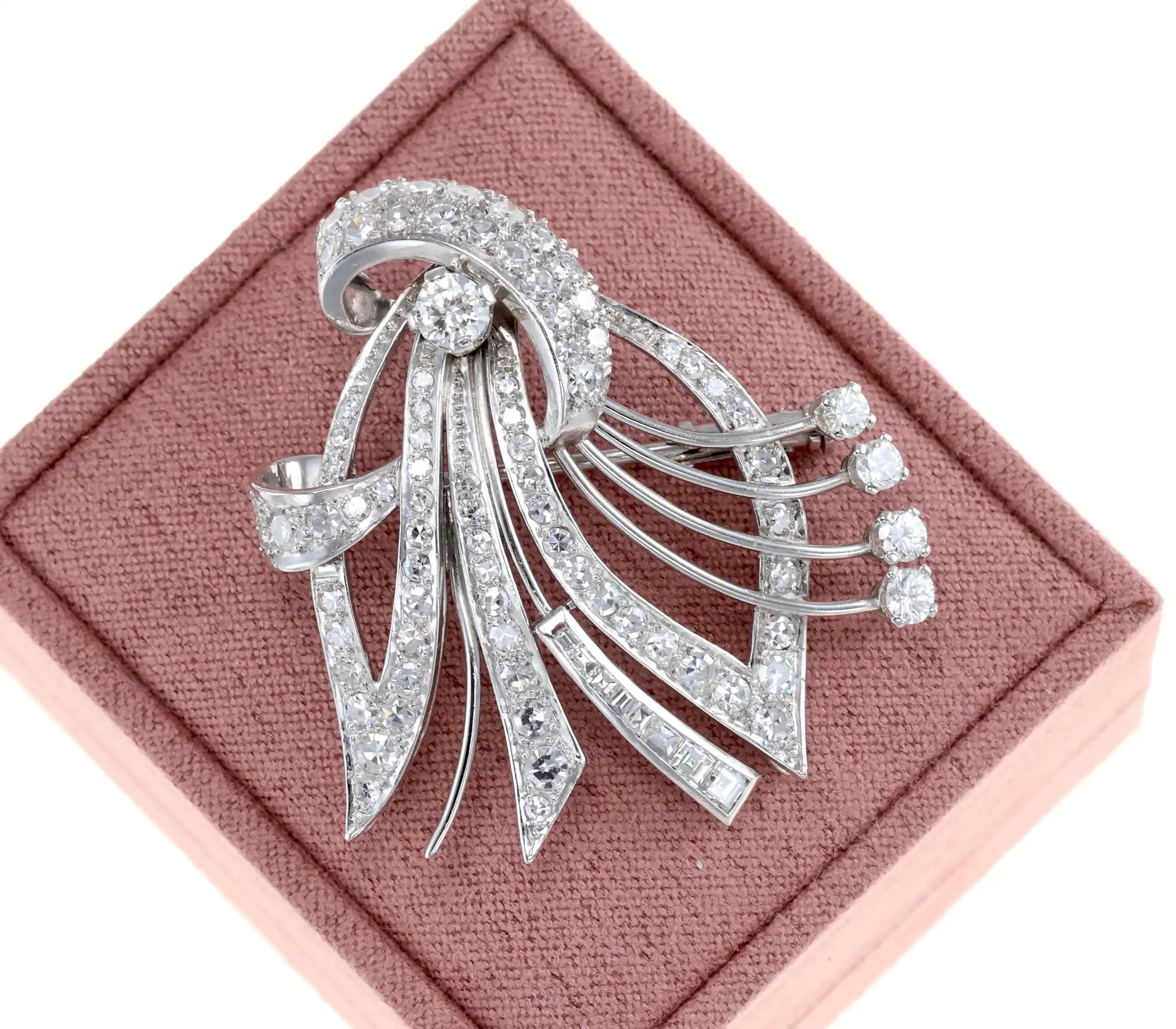 Przedmiotem sprzedaży jest okazała broszka wykonana z platyny, zachwycająca dynamiczną, wachlarzową kompozycją. Jej misternie poprowadzone linie zdobi imponujący blask diamentów o łącznej masie ok. 2,55 ct — od pełnych ognia brylantów, przez eleganckie bagiety, aż po subtelne diamenty w szlifie ósemkowym. Platynowa oprawa podkreśla jakość i wyrafinowanie projektu, czyniąc z tej broszki ekskluzywny dodatek do kolekcji miłośniczki historycznego jubilerstwa.