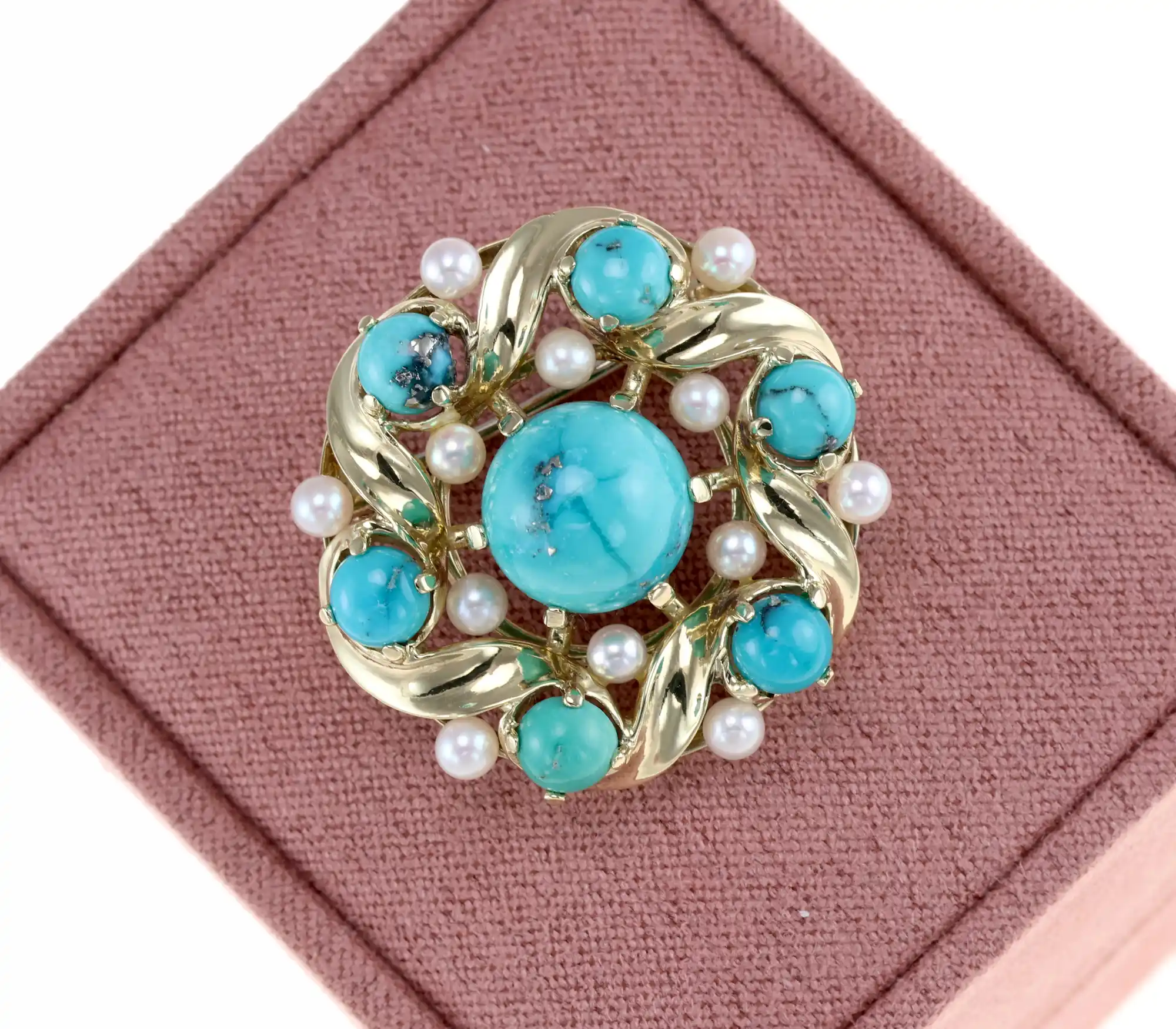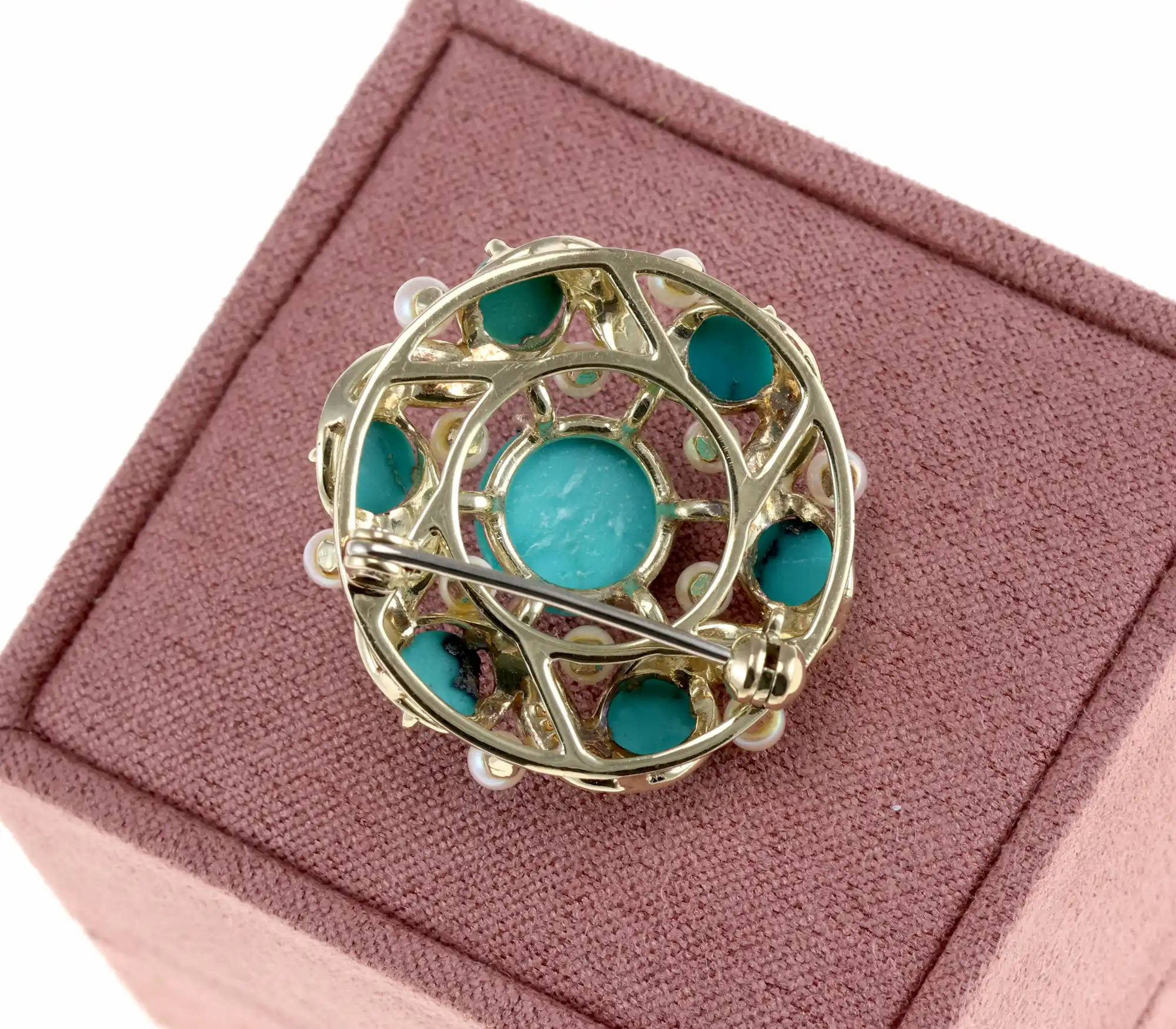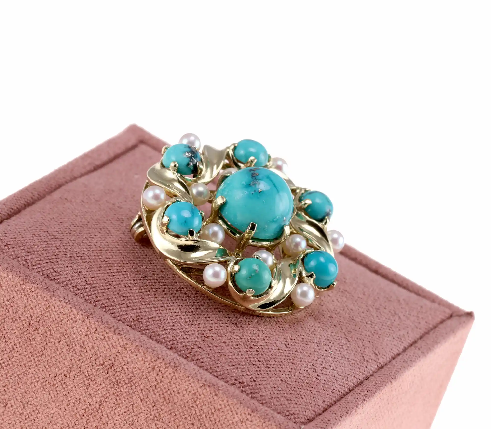 Przedmiotem sprzedaży jest elegancka złota broszka kształtem przypominająca wieniec. Broszka zdobiona turkusami i drobnymi perłami słodkowodnymi.